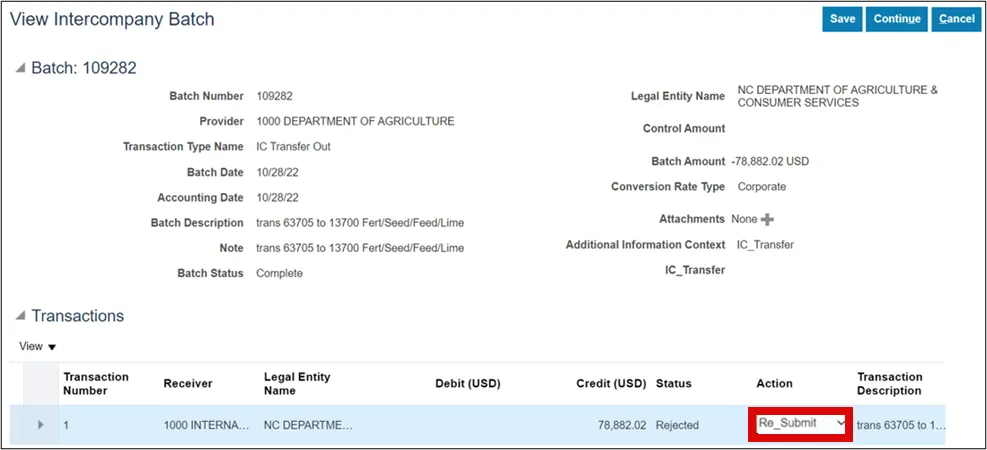 Step 3.    On the View Intercompany Batch page, click the Action drop-down choice list option and select the Re-Submit option.