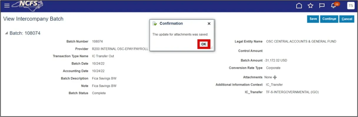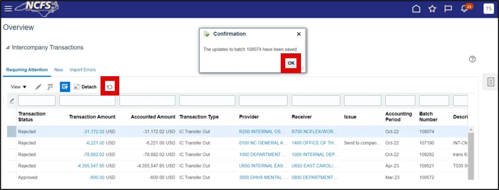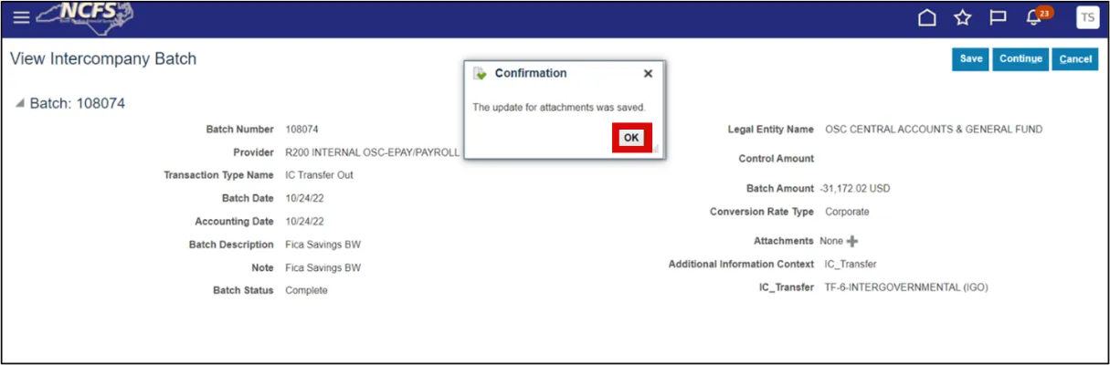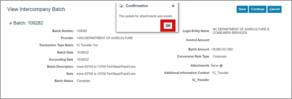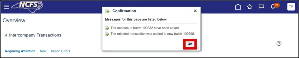 Step 9.    You will receive a message that the batch has been updated and saved. Select the OK button and this will end the process and return you to the Intercompany Transactions Overview page.