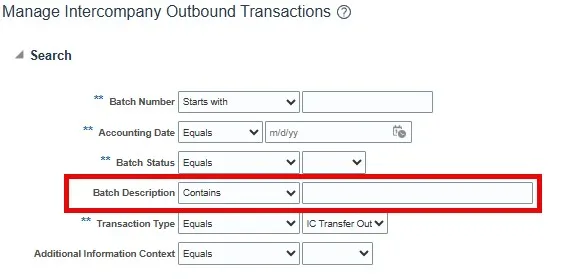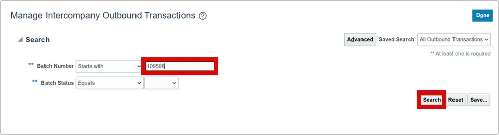 Step 10.    On the Manage Intercompany Outbound Transactions page enter the new Batch Number in the search criteria field and select the Search button.