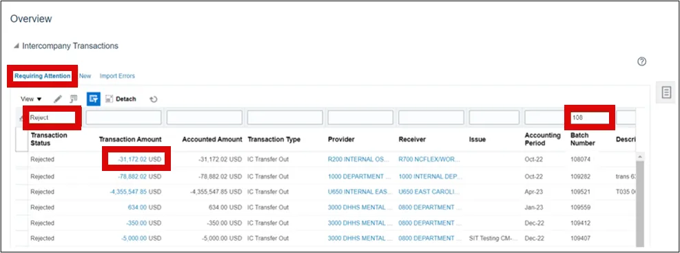 Step 3.    On the Intercompany Transactions Overview page, under the Requiring Attention tab, identify the rejected Batch Number. After typing in the batch number, hit the Enter key on your keyboard. This will isolate all other results, only showing the desired transaction. Now open the transaction by clicking the Transaction Amount link.