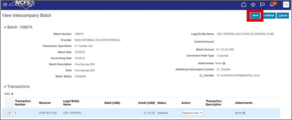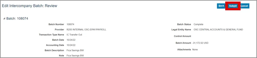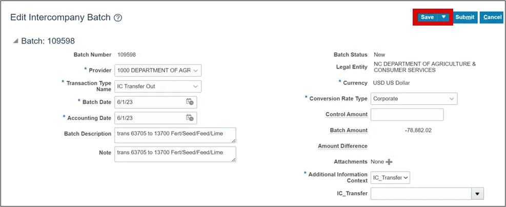 Step 12.    Once on the Edit Intercompany Batch page, you can make the necessary changes and select the Save button to save your transaction.