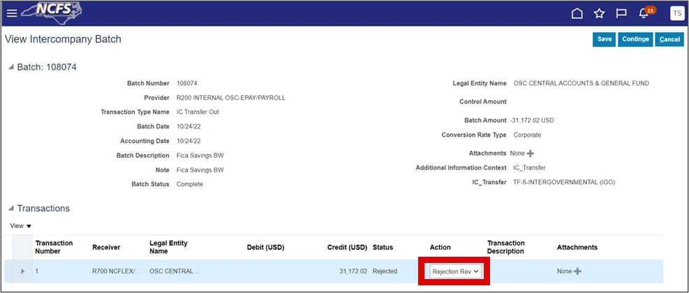 Step 4.    On the View Intercompany Batch page, click the Action drop-down choice list option and select the Rejection Reviewed option.