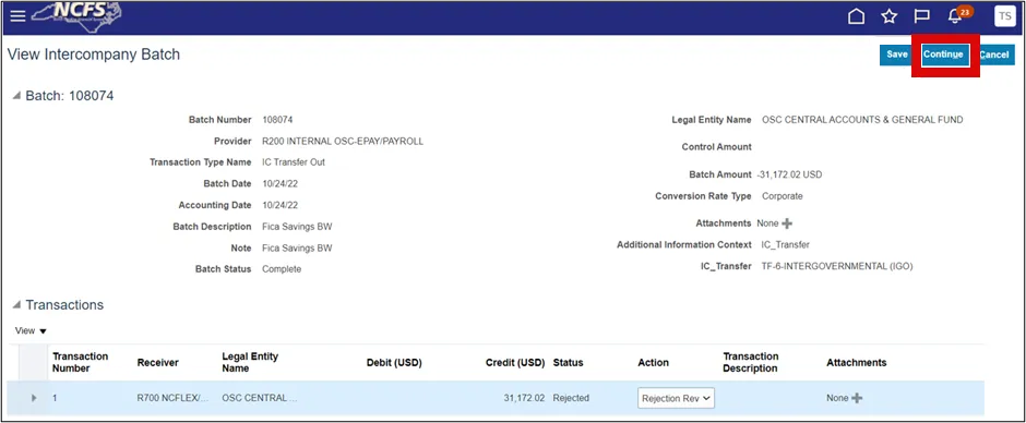 • Rejected IC transfers in NCFS can be resolved by editing and Re-Submitting it, or by selecting Rejection Reviewed to accept the rejection and finalize the transaction.