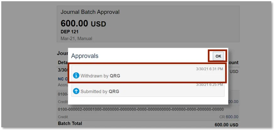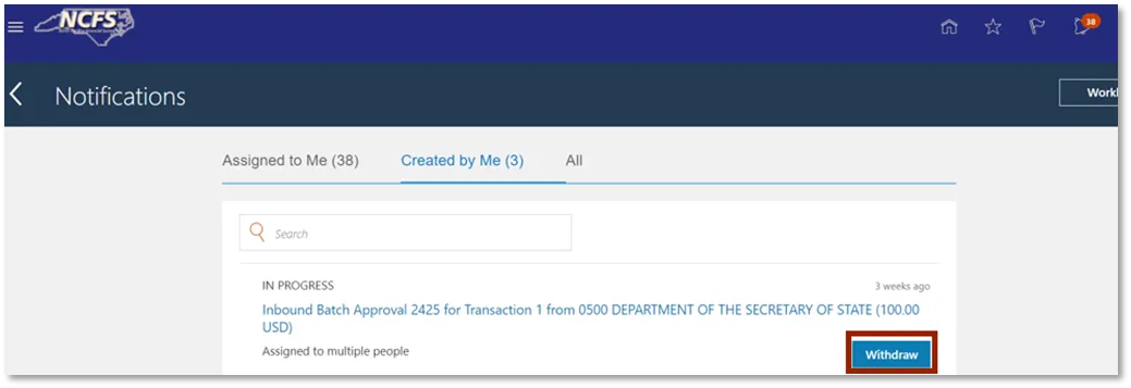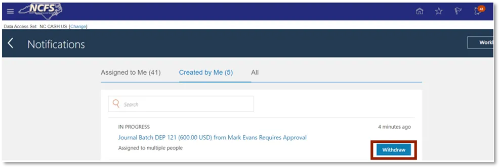 A withdrawal must take place before a transaction (journal entry and intercompany entry) has been approved. If the transaction has been approved and posted the user must reverse the transaction to remove it. In order to create a withdrawal, the transaction must be in “Complete” and “In Process” (Journal Entry) status or “Received” (Intercompany) transaction status.