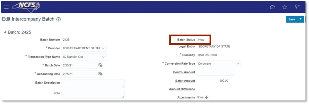 Step 2. Click New and identify the Intercompany Transaction and click the Batch Amount Hyperlink.