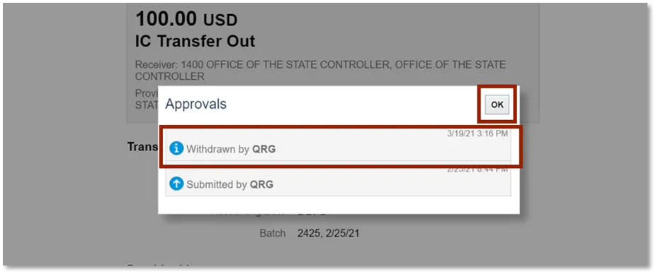 Step 3. Confirm the transaction was withdrawn, then click OK.