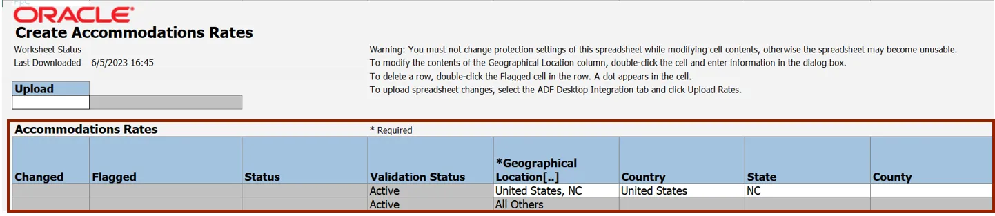 Step 11. On the Create Accommodations Rates spreadsheet, the Accommodation Rate details are displayed.
