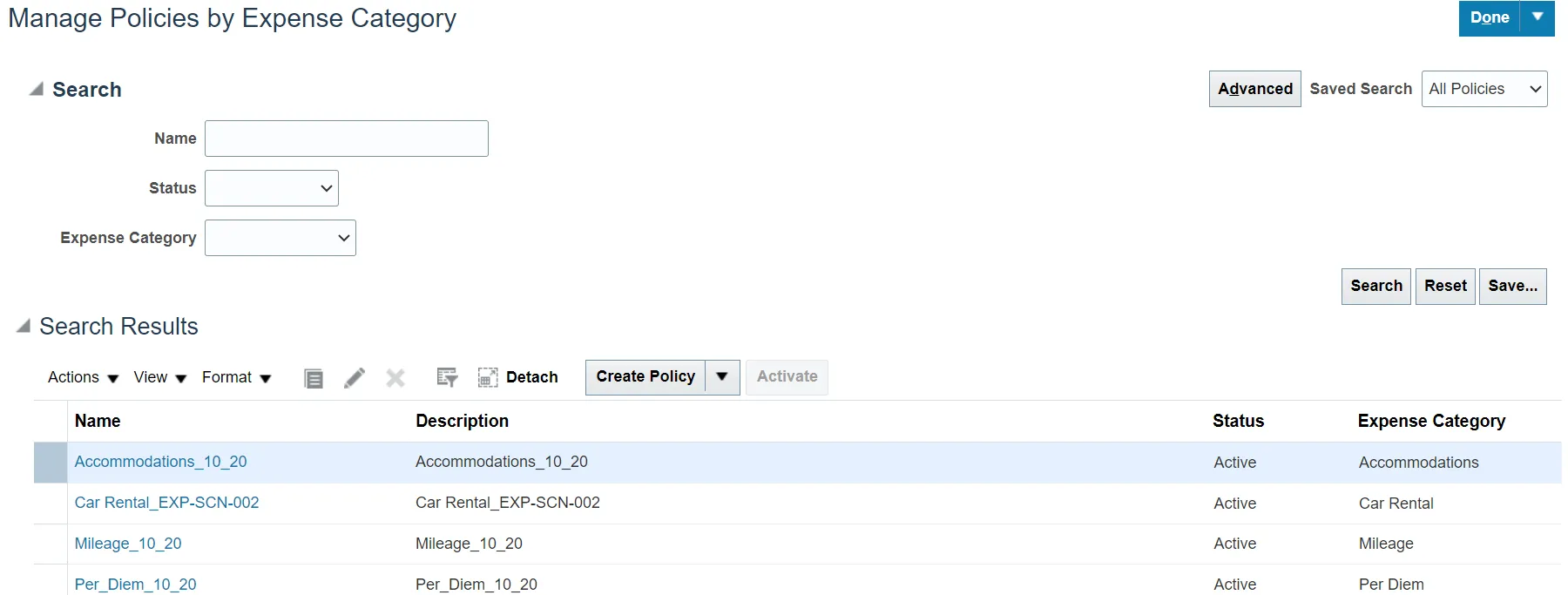 Expense Module Setup – Manage Expense Policies