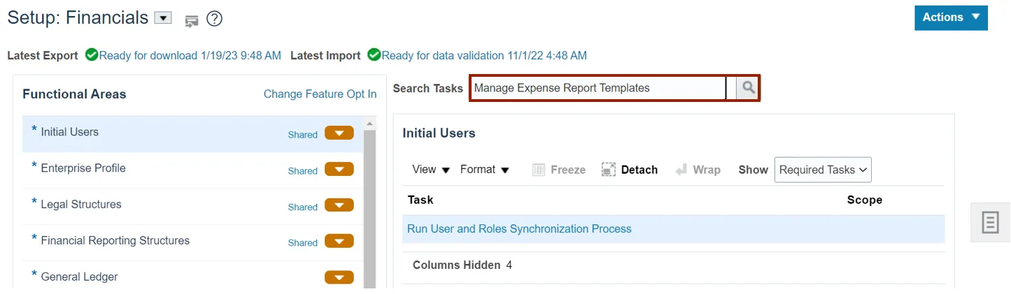 Step 2. On the Setup: Financials page, in the Search Tasks section, enter Manage Expense Report Templates and click the Search icon.