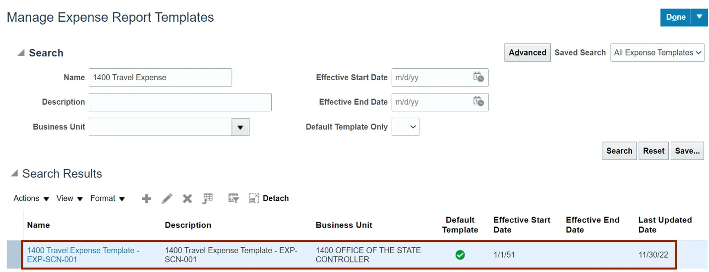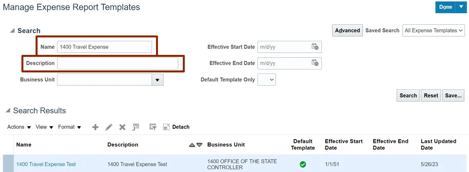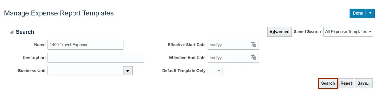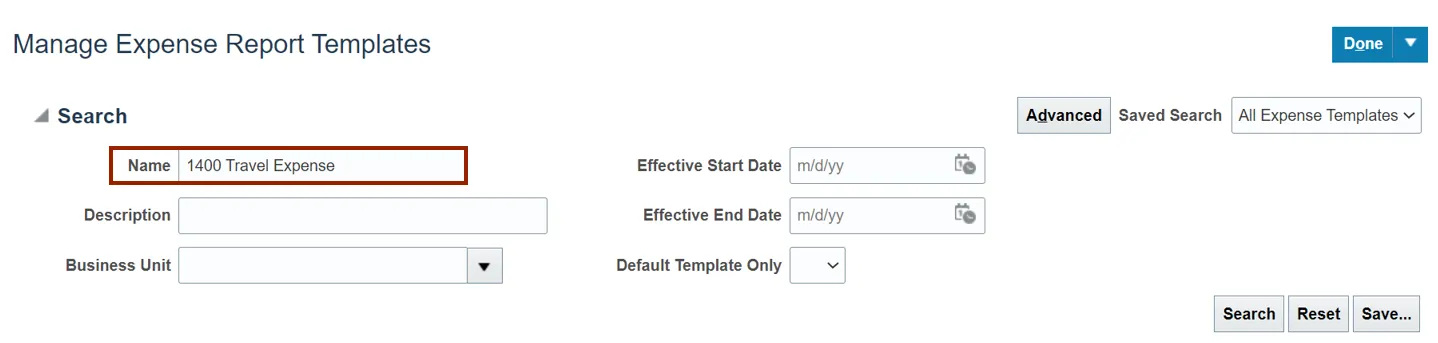 Step 14. On the Manage Expense Report Templates page, you can search for the Expense Report template using the edited Name or Description Name.
