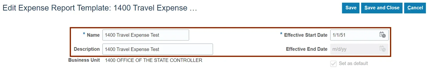 Step 7. On the Edit Expense Report Template page enter *Name, Effective Start Date, and Description.