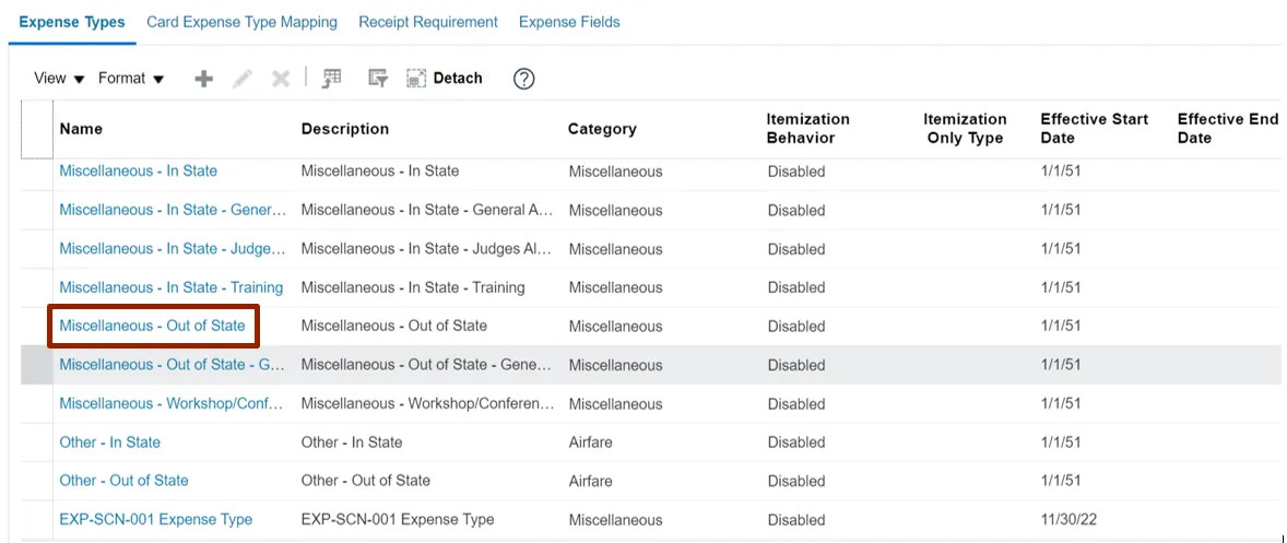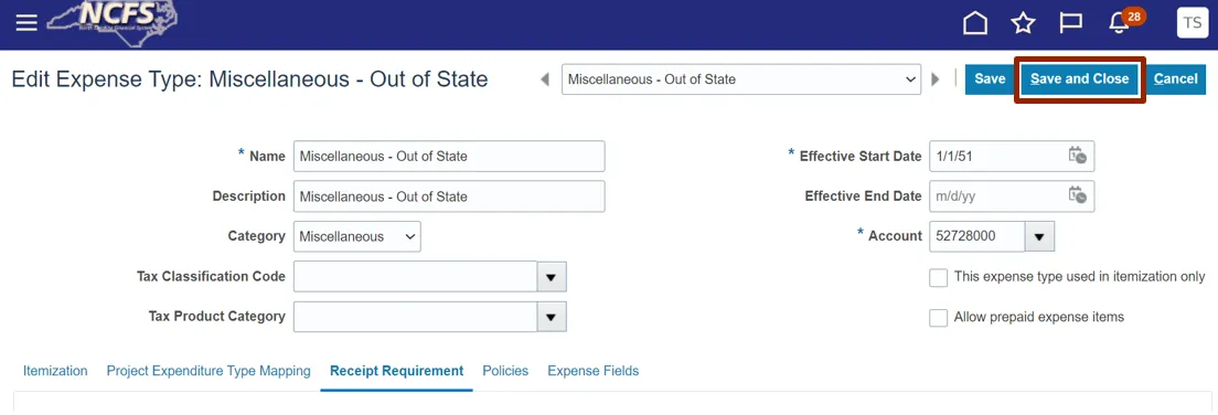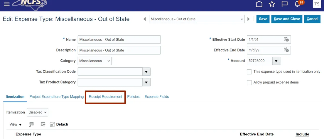Step 9. The Edit Expense Type: Miscellaneous – Out of State page appears. Click the Receipt Requirement tab.