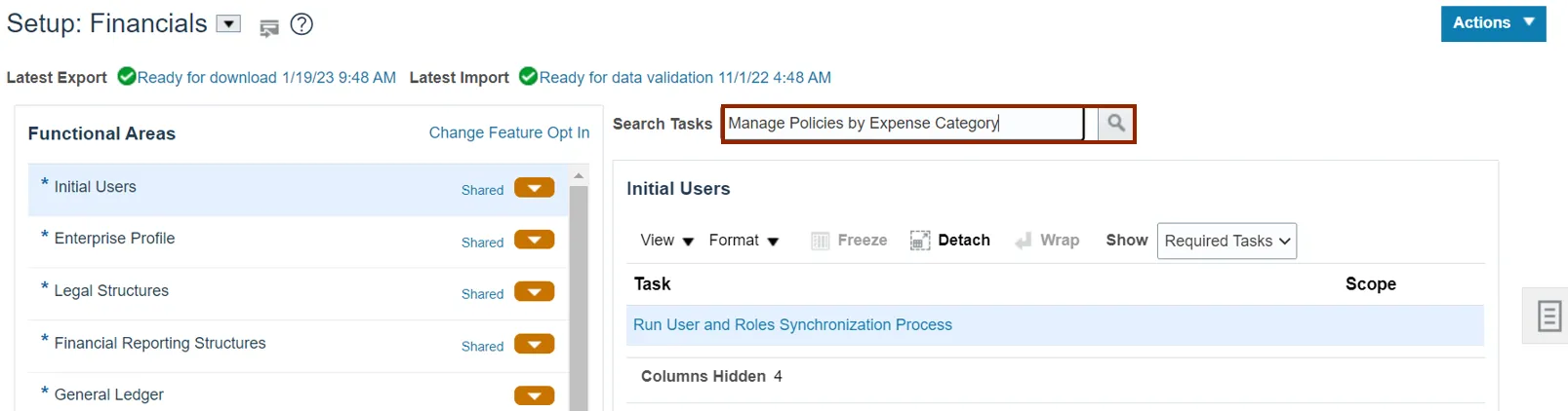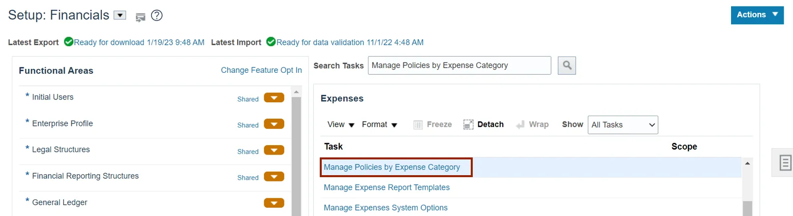 Step 4. On the Setup: Financials page, in the Search Tasks section, enter Manage Policies by Expense Category and click the Search icon.