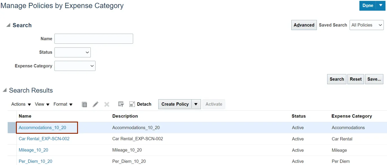 Step 17. On the Manage Policies by Expense Category page, the Expense Policies are displayed with the changes.