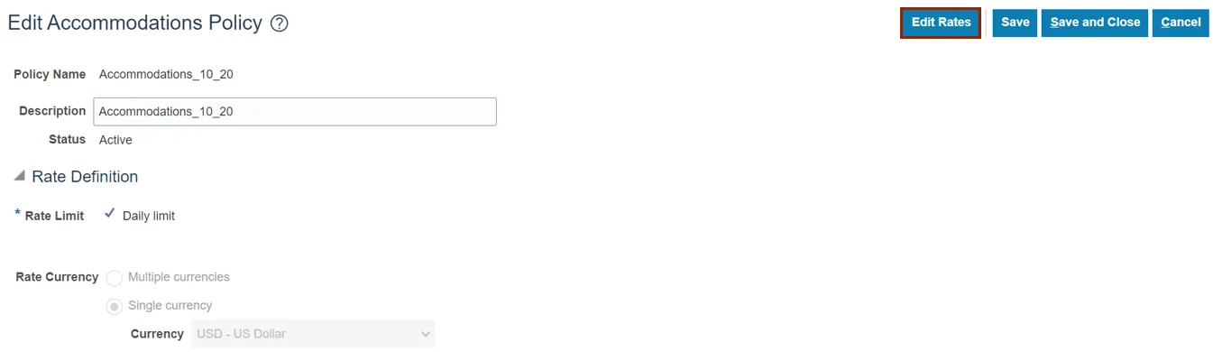 Step 16. Go back to the Edit Accommodations Policy page and click the Save and Close button. You are redirected to the Manage Policies by Expense Category page.