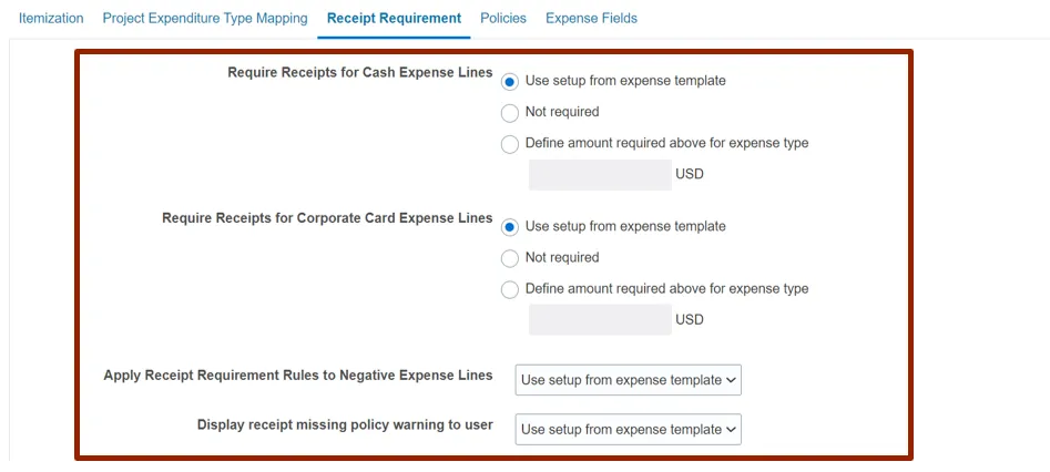 Step 10. Under thew Receipt Reimbursement tab, validate that the Receipt Requirements are accurate for the specific expense type being viewed. If required to change, update as needed.