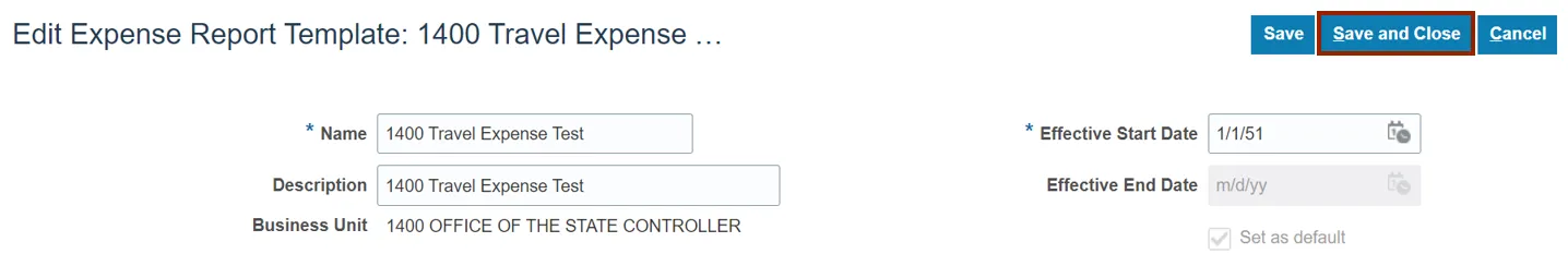 Step 11. Click the Save and Close button. You are redirected to the Edit Expense Report Template page.