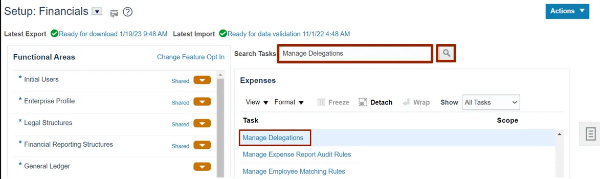 Step 2. On the Setup: Financials page, in the Search Tasks section, enter Manage Delegations and click the Search icon and from the Task section, select Manage Delegations. The Manage Delegations page opens.