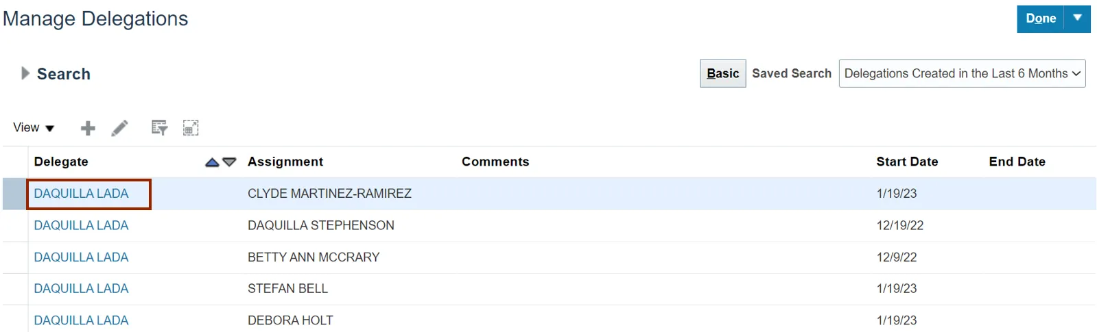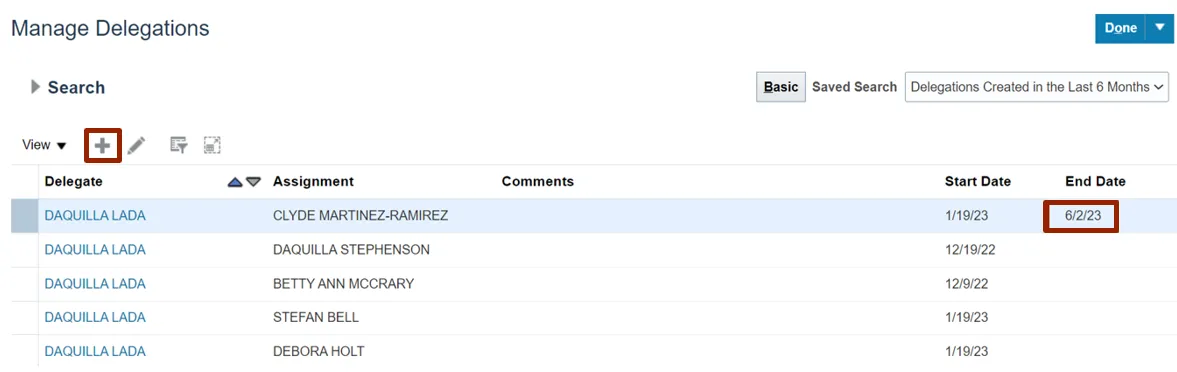 Step 6. On the Manage Delegations page, the Delegate End Date column is updated.