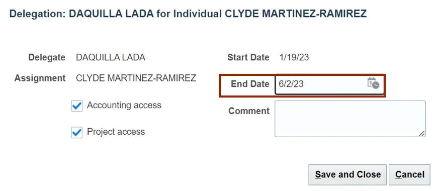 Step 4. On the Delegation: DAQUILLA LADA for Individual CLYDE MARTINEZ-RAMIREZ pop-up, select the End Date by clicking on the Calendar icon.