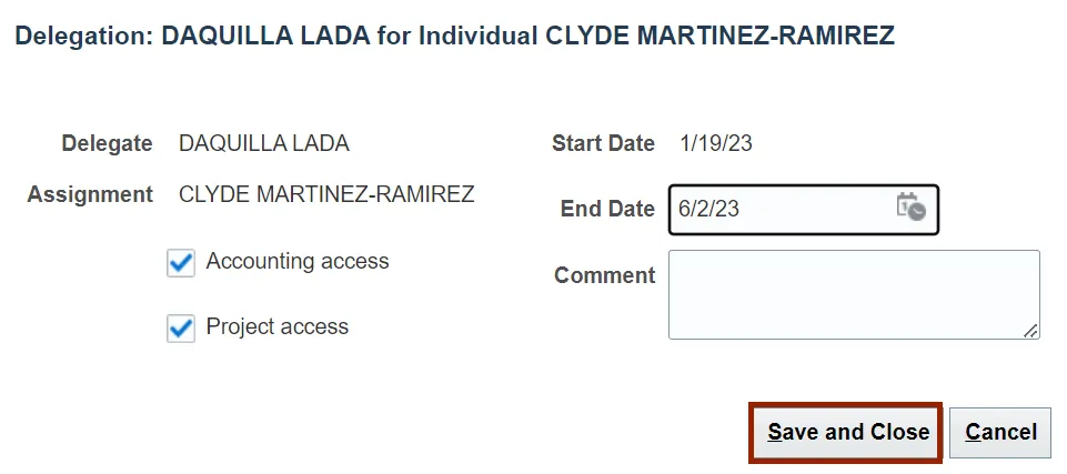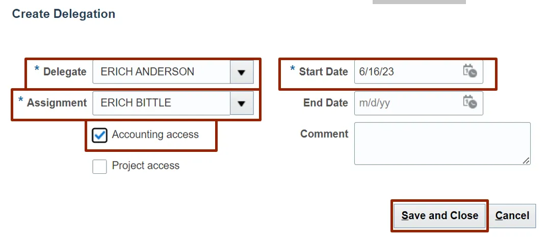 In this example, we choose ERICH ANDERSON for *Delegate, ERICH BITTLE for *Assignment, and 6/16/23 for *Start Date. Select the Accounting access checkbox and click the Save and Close button.