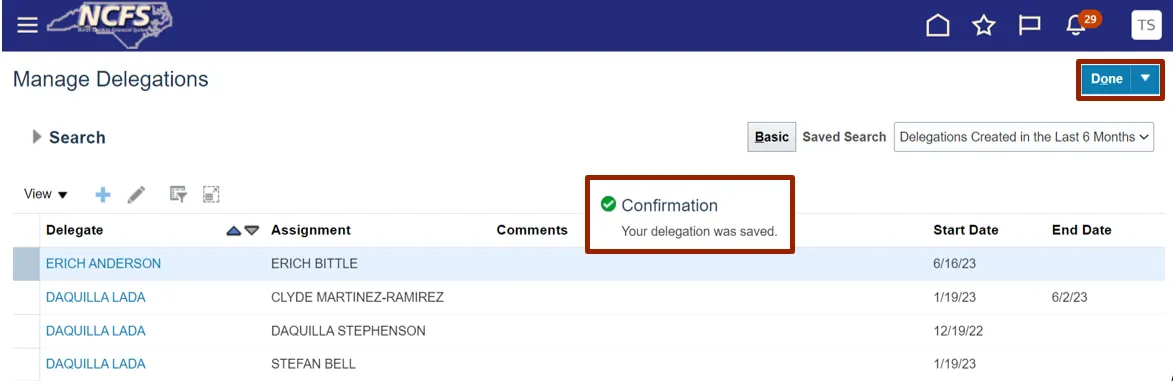 Step 8. On the Manage Delegations page, a Confirmation pop-up appears. Click the Done button. You are redirected to the Setup: Financials page.