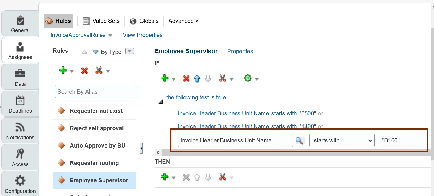 In this example, we choose Invoice Header.Business Unit Name starts with “B100”.