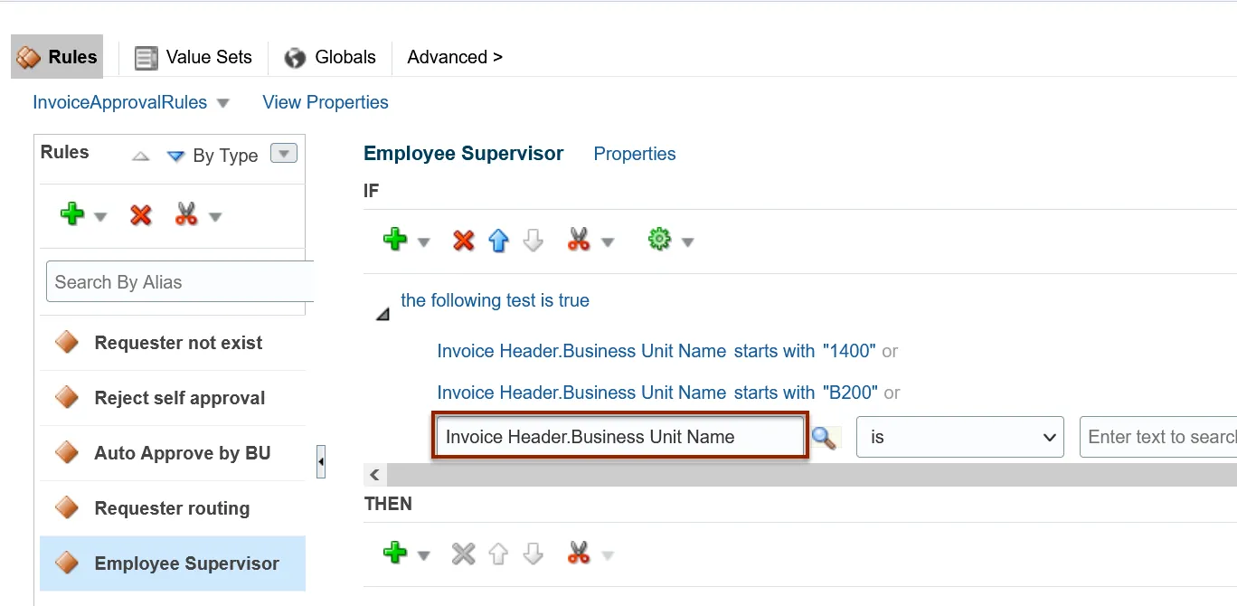 In this example, choose “Invoice Header.Business Unit Name” for the condition.