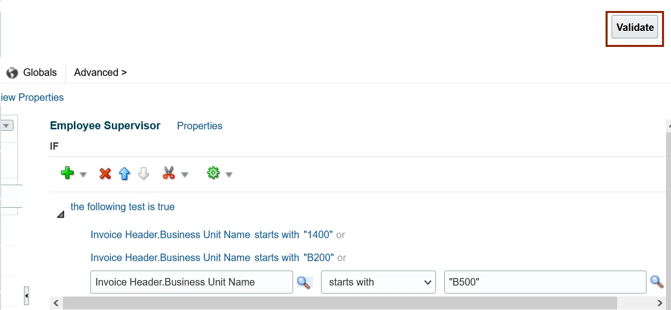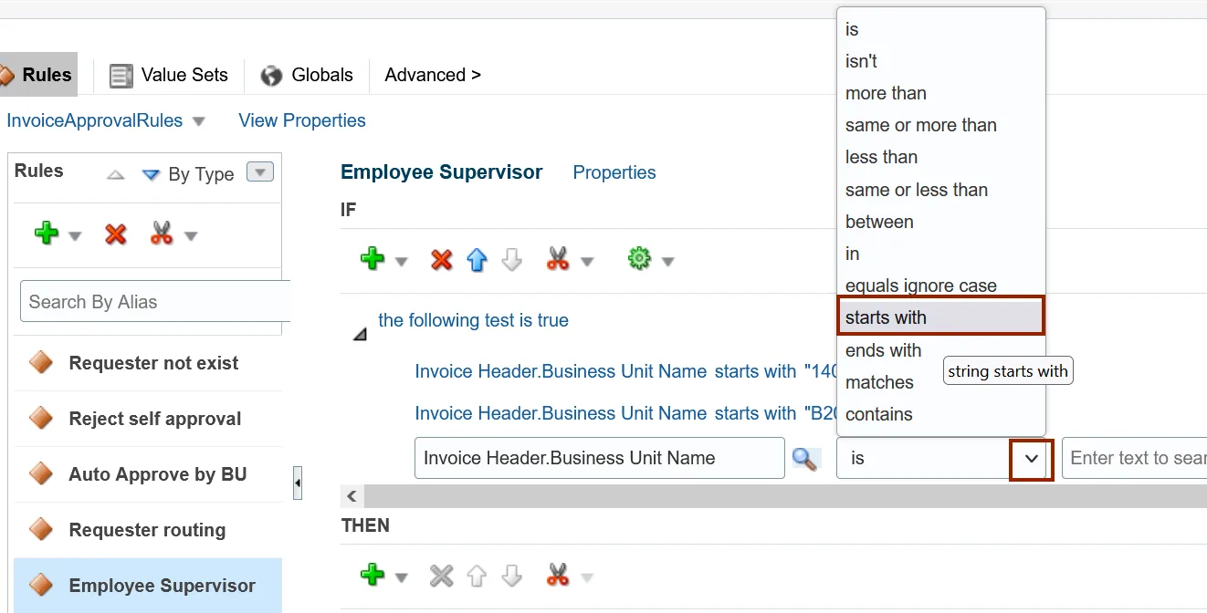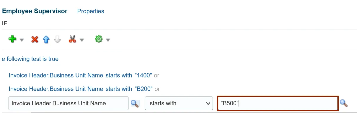 In this example, we choose Invoice Header.Business Unit Name starts with “0500”.