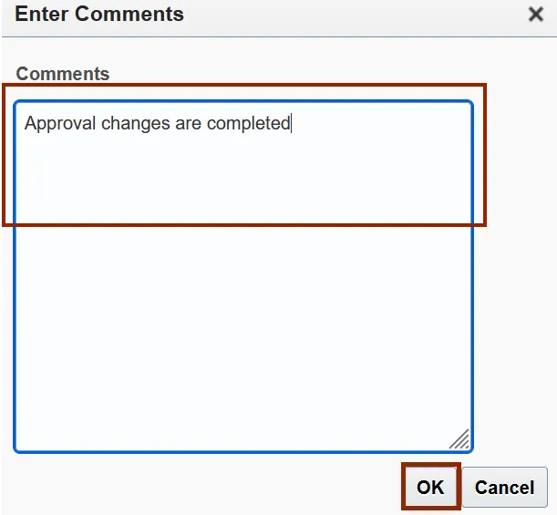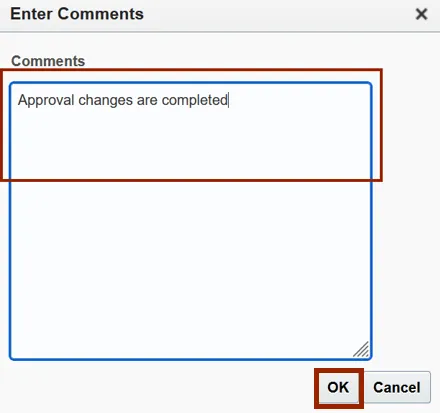 Step 22. On the Enter Comments pop-up page, enter appropriate comments and click the OK button.