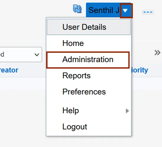 Step 4. In the top right corner of the BPM Worklist page, click the drop-down choice list icon and select Administration.