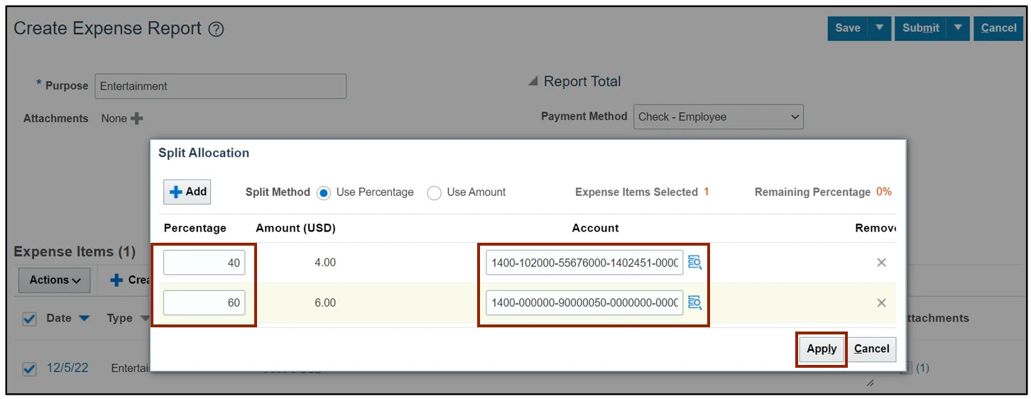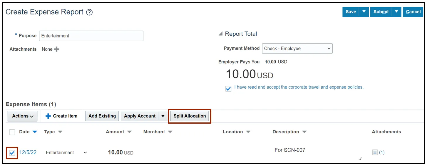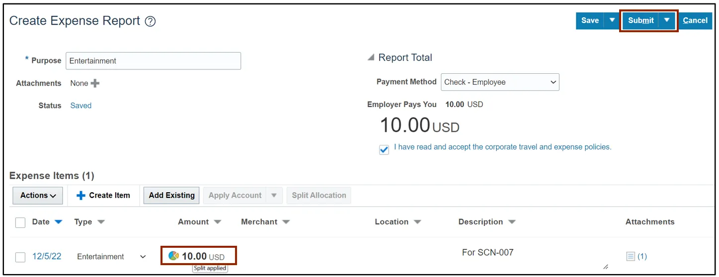 Step 3.    On the Expense Report page, the split applied is displayed. Click the Submit button.