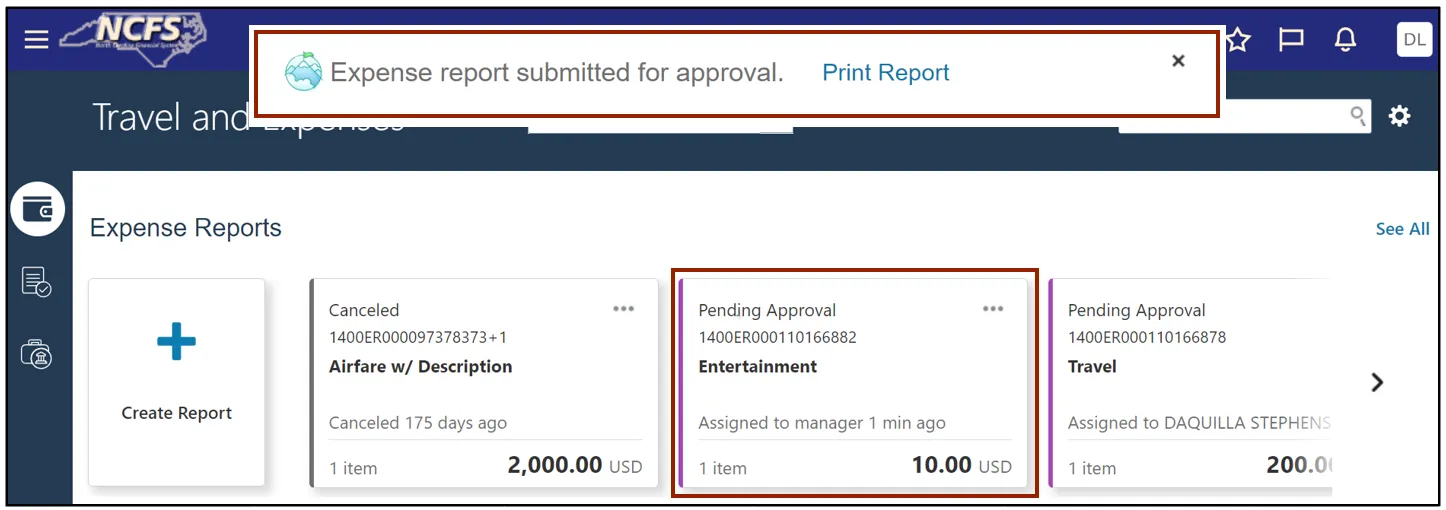 Step 4.    A Confirmation pop-up appears. The Expense Report is submitted for approval and the status shows as Pending Approval.