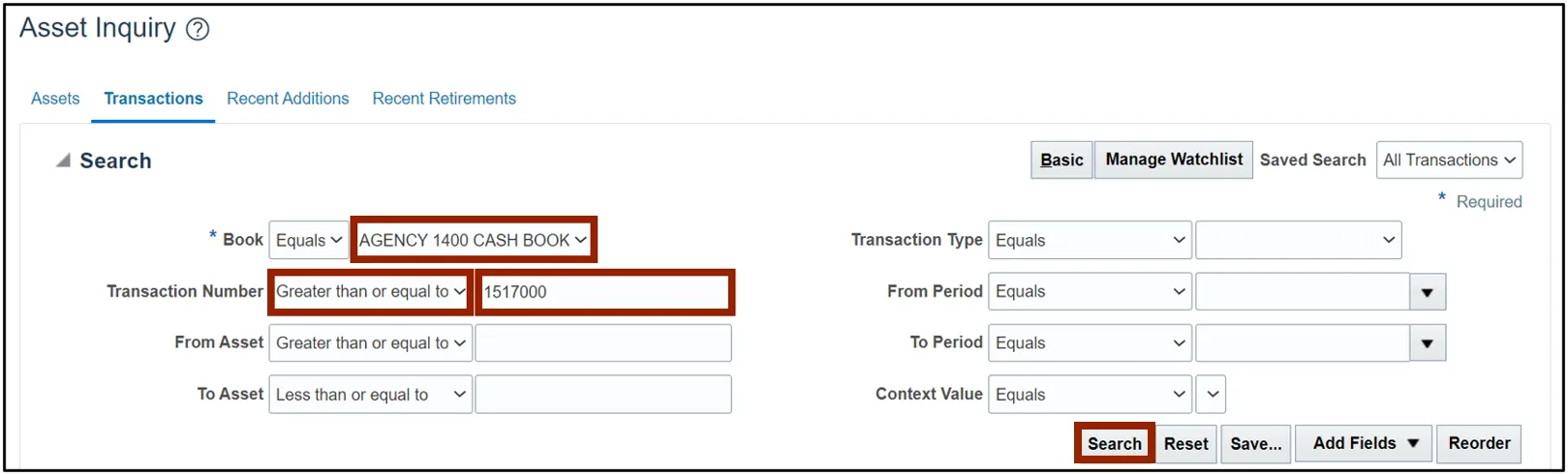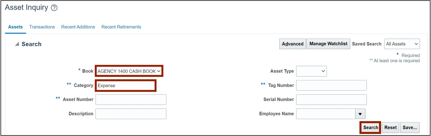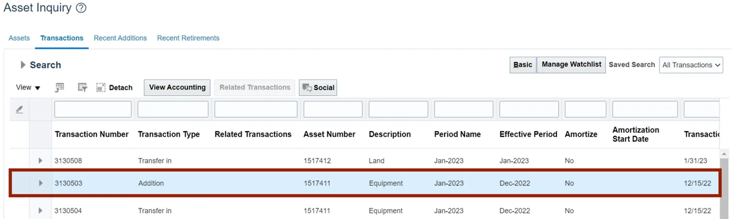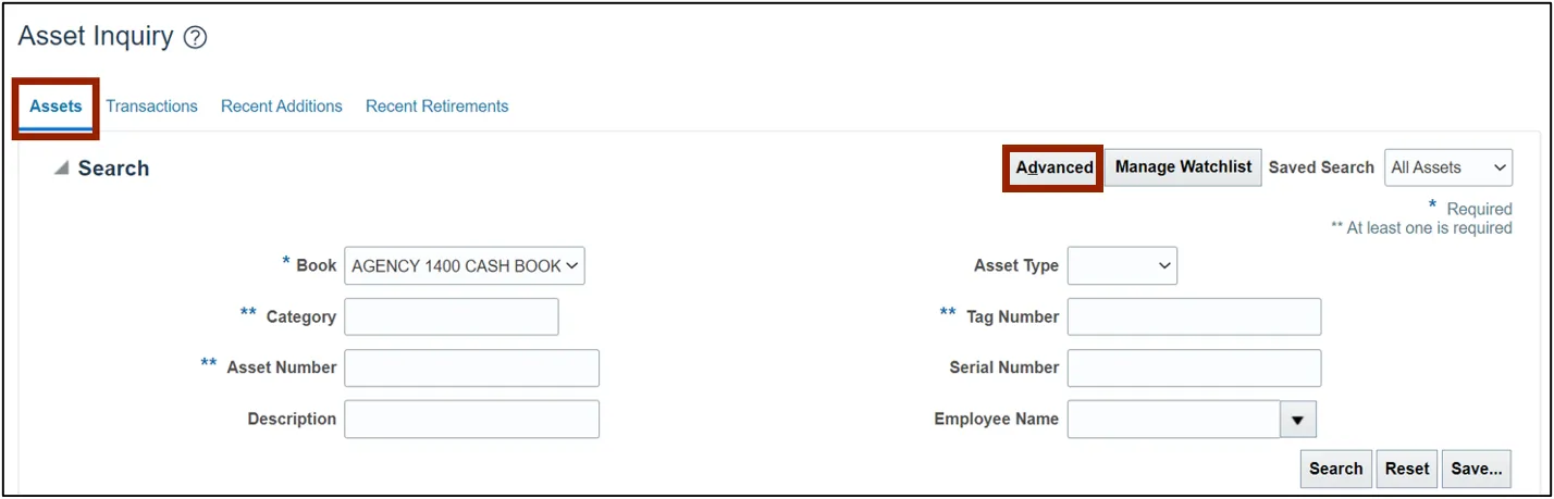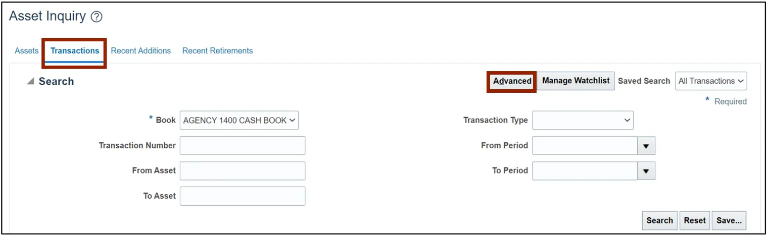 View assets and asset transactions through a basic or an advanced search using the steps above.