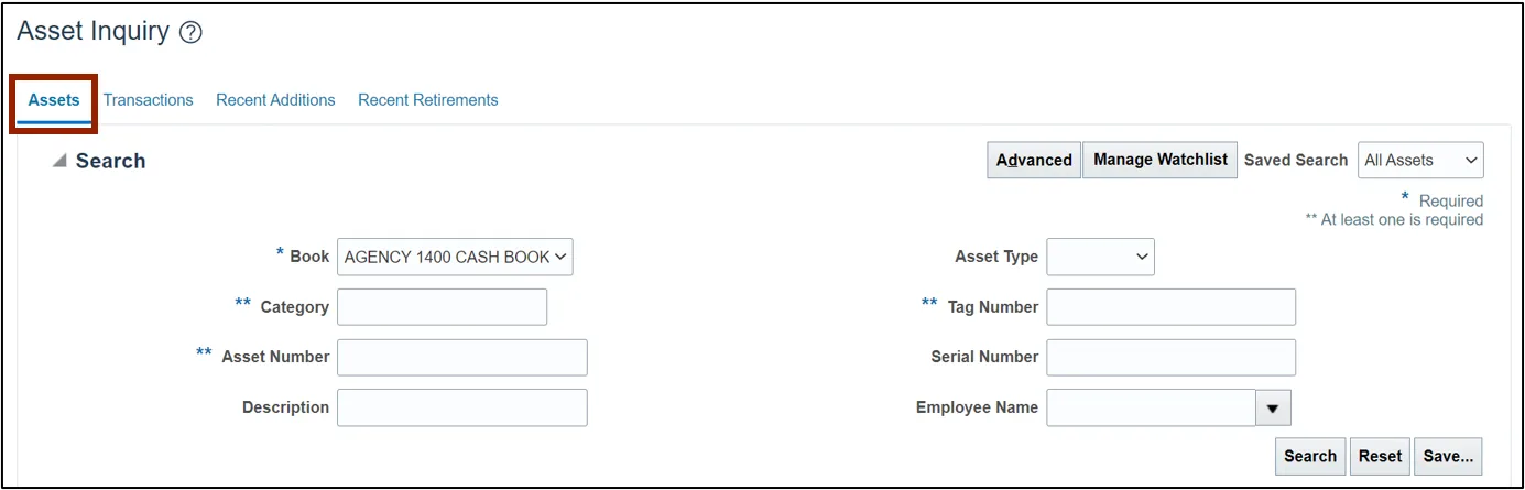 Step 3. Select the Assets tab, by default it allows to conduct a basic Assets inquiry.