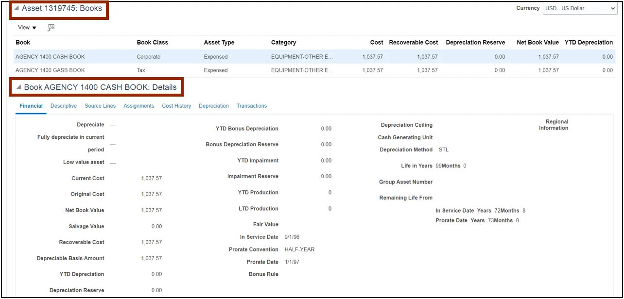 Step 6. Scroll down to view asset information on the Asset 1319745: Books and Book AGENCY 1400 CASH BOOK: Details sections.