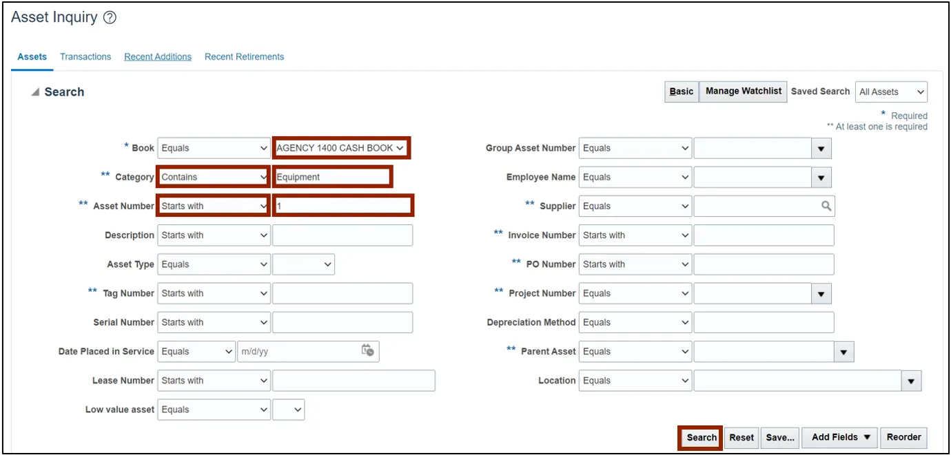 In this example, we choose Contains Equipment in the Category field and Starts with 1 in the Asset Number field.