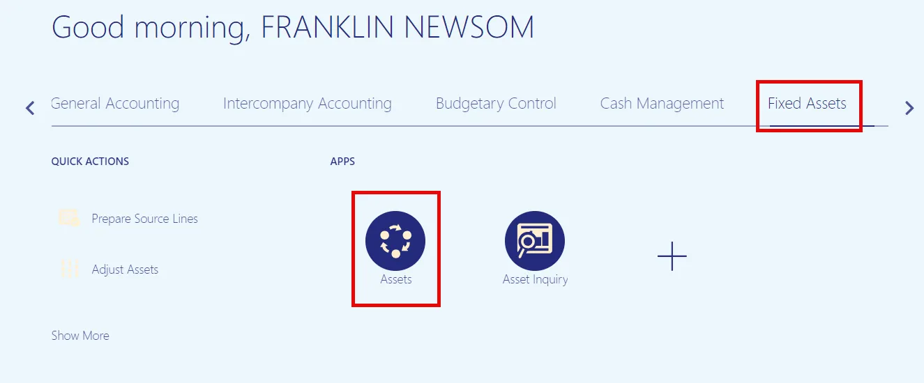 Step 2.    On the Home page, under the Fixed Assets tab, click the Assets app.