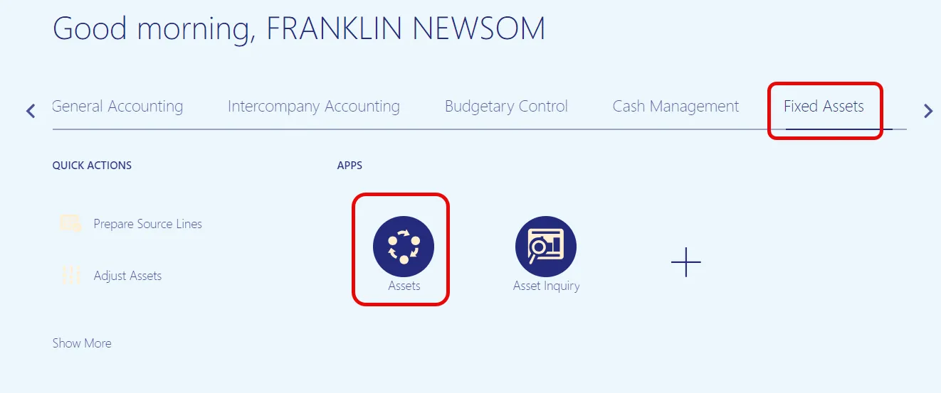 Step 2. On the Home page, under the Fixed Assets tab, click the Assets app.