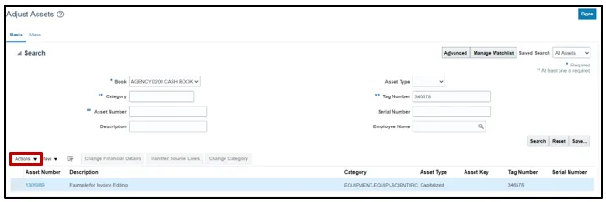 Step 5. Select the asset record (click the description and have the line highlighted). Then open the Actions drop-down list.