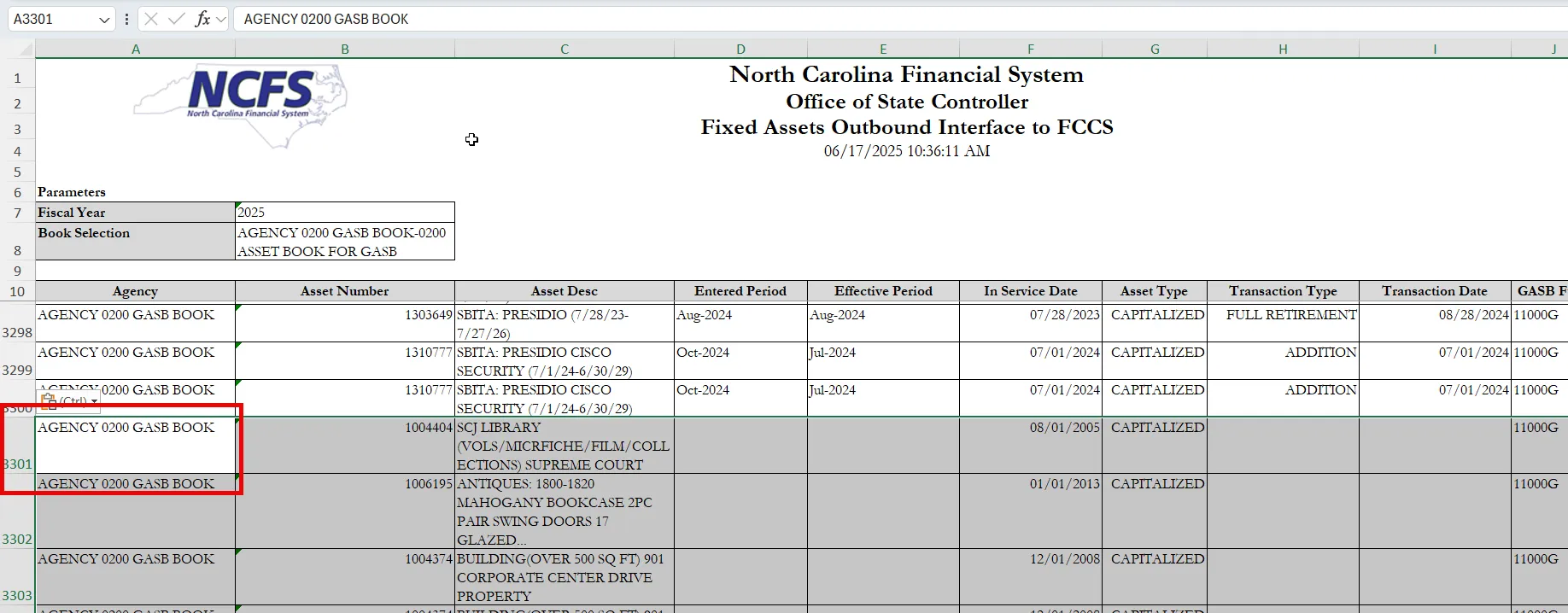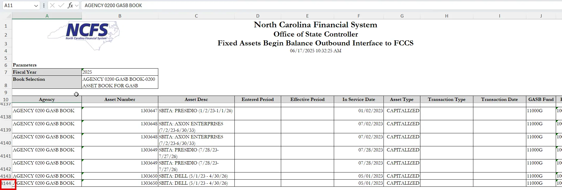 The purpose of this Quick Reference Guide (QRG) is to provide a step-by-step explanation on how to combine the FBR Fixed Assets Outbound Interface to FCCS Report (INTFA006) and FBR Fixed Assets Begin Balance Outbound Interface to FCCS Report (INTFA007) in the North Carolina Financial System (NCFS).