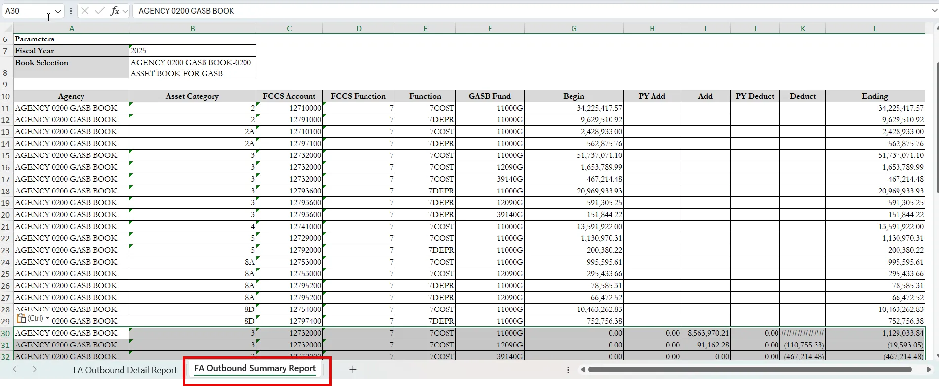 • Shows the beginning balances of the asset record for the parameter fiscal year.