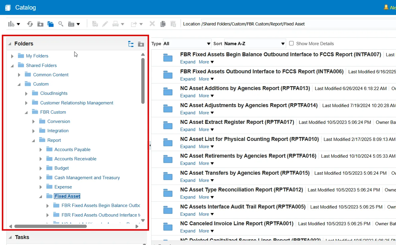 Step 4.    A new tab will open.  Navigate to the Fixed Assets folder with the following path in the Folder pane: Shared Folders -> Custom -> FBR Custom -> Report -> Fixed Asset.