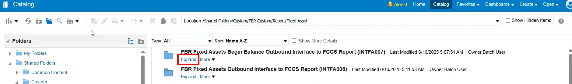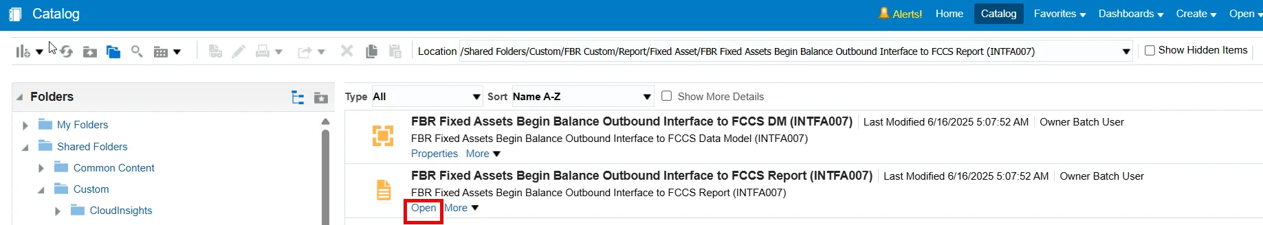 Step 5.    Below the FBR Fixed Asset Begin Balance Outbound Interface to FCCS Report (INTFA007), click the Expand button.  Once in the report folder, click the Open button.