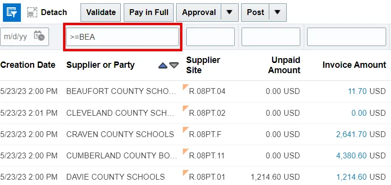 Note: There is an additional consideration when using (>, <, >=, <=). A space character “ “ is considered part of the filter value. For example, if you enter >= def (with a space before the “d”) then “def” and “deg” must be preceded by a space character for this text to match the QBE filter.