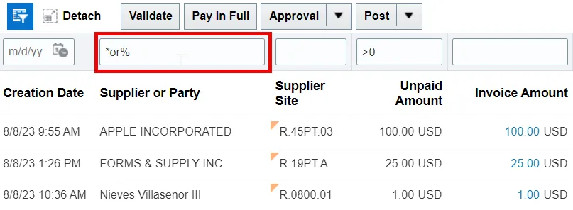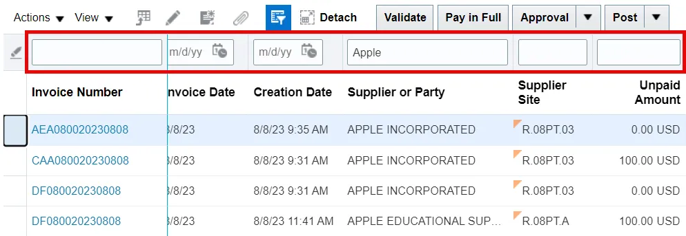 - Enter the desired filtering operators, wildcards, alphanumeric values, or dates into the corresponding QBE fields, then press the Enter key.
