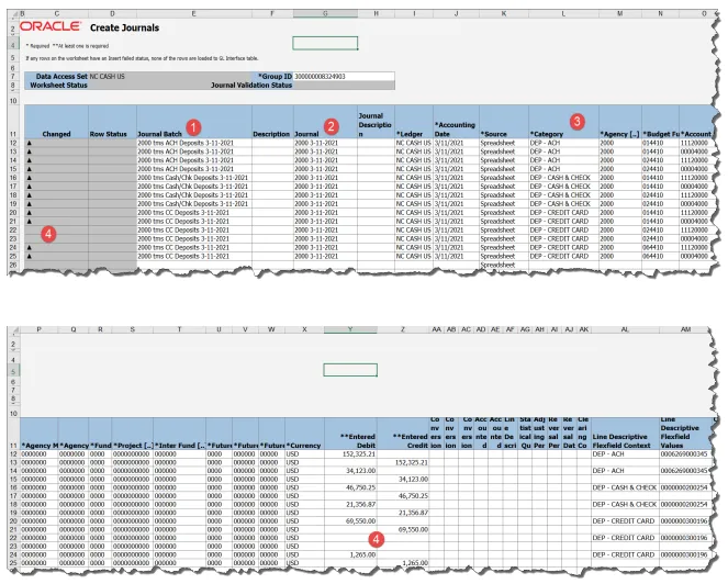 Step 2.    In the example below, there are three Journal Batch names (column E). Each Journal Batch name is associated with one deposit category (column L). When the file is uploaded, NCFS creates three separate batches to approve/post.