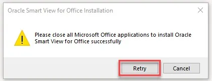 Step 6.    If all Microsoft Office applications have not been closed, the pop-up below will appear. Close all Microsoft Office applications and click Retry.