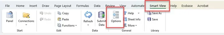 Step 9.    Click Options on the Smart View tab to make a connection to NCFS.