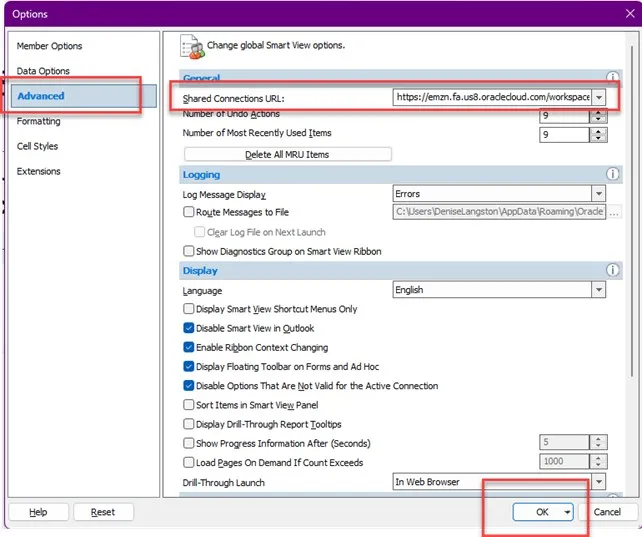 Step 10.    Click on Advanced to update the Shared Connections URL: to https://emzn.fa.us8.oraclecloud.com/workspace/SmartViewProviders. Then click OK.